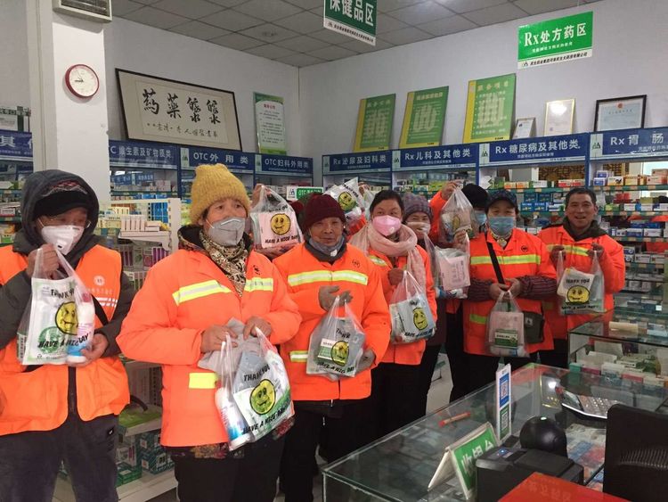 民生大药房嵩县欣康店向环卫工人爱心捐赠应急防疫物资。