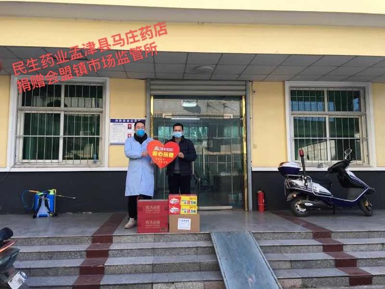 民生大药房孟津马庄店向会盟镇市场监管所、会盟镇油坊村委会、会盟镇马庄村委会爱心捐赠应急防疫物资。