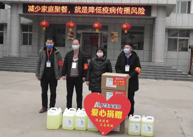 民生大药房伊滨区乐美店向伊滨区李村镇陈沟村委会、李村镇疫情控制点爱心捐赠应急防疫物资。