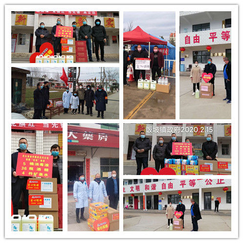 民生大药房嵩县德生堂店向饭坡镇政府、饭坡镇常岭村执勤点、黄庄乡政府爱心捐赠应急防疫物资。
