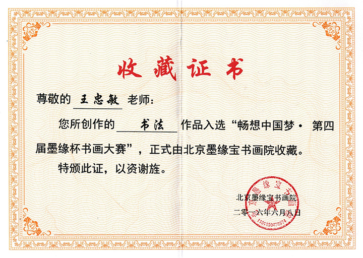 “第四届墨缘杯”收藏证书